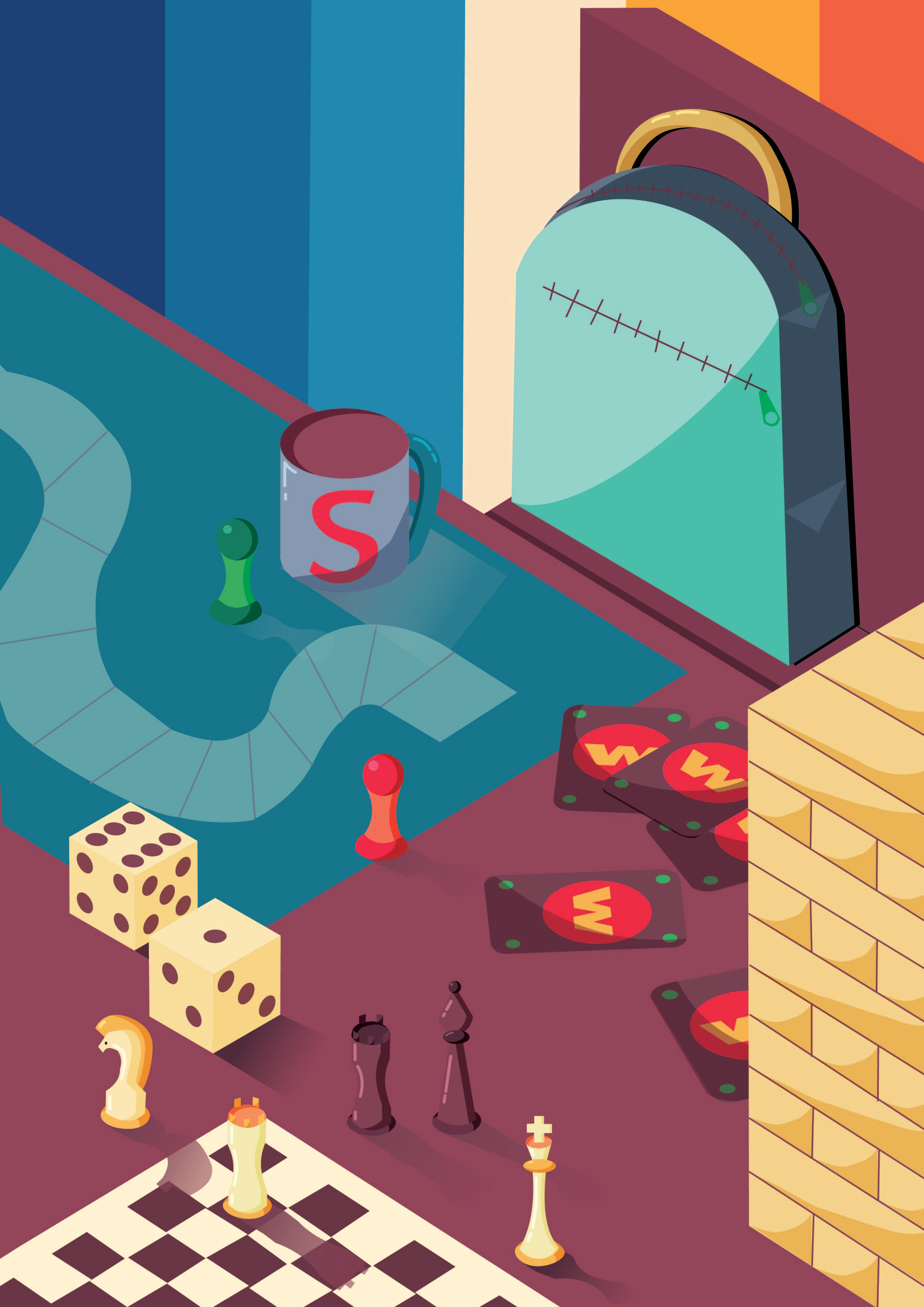 The object I choose are board game and board game as I love this game as a child. I show many different games to show my love of board game. The card back I make it look similar to the game I play call Magic the Gathering. The mug is there to show comfort and friendly game. The bag is there as I bring a bag to a shop to play with my friends. The colour palette here is a retro colour since we all think that board games are old fashion. Lastly, my short name (SW) is seen in the back of the cards(W) and the mug(S)